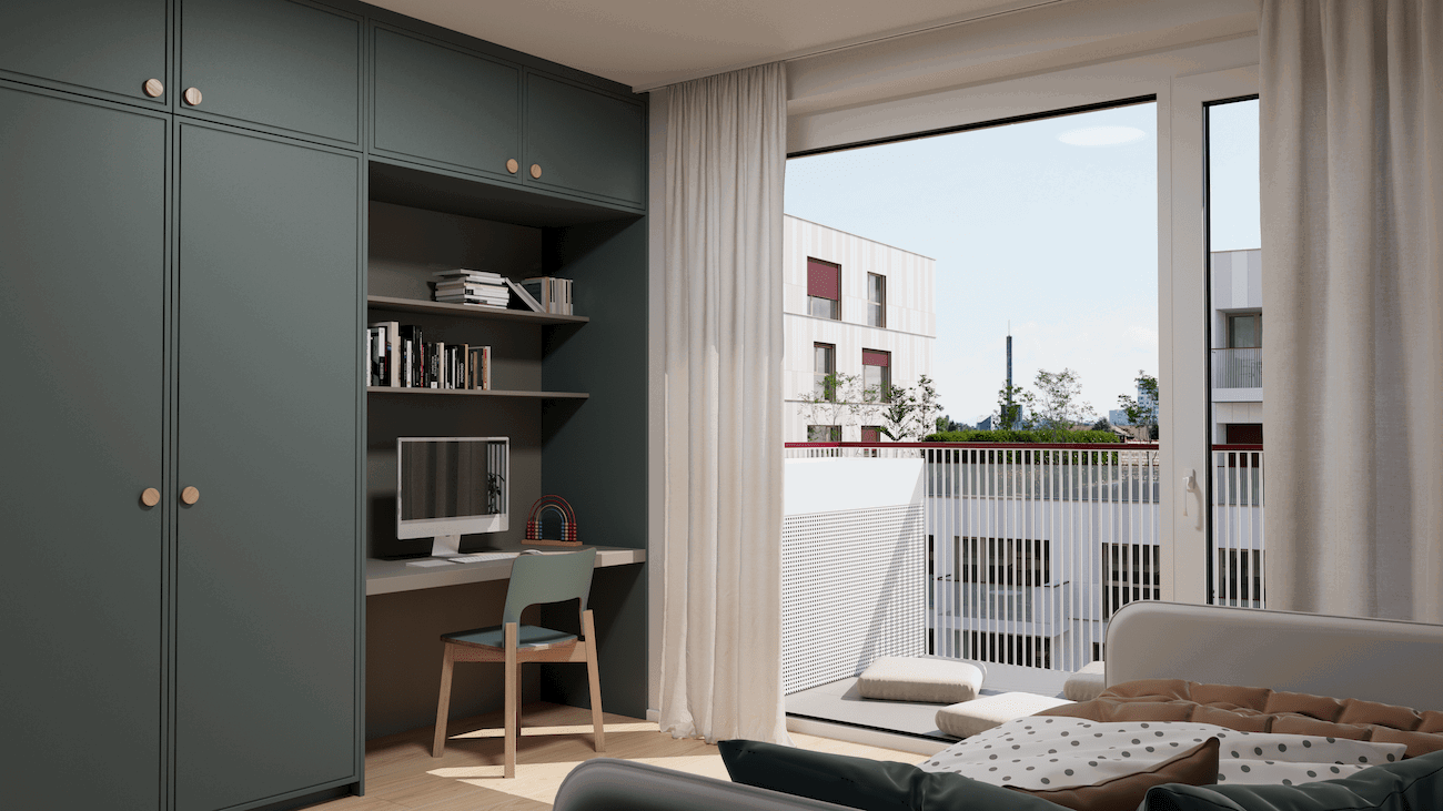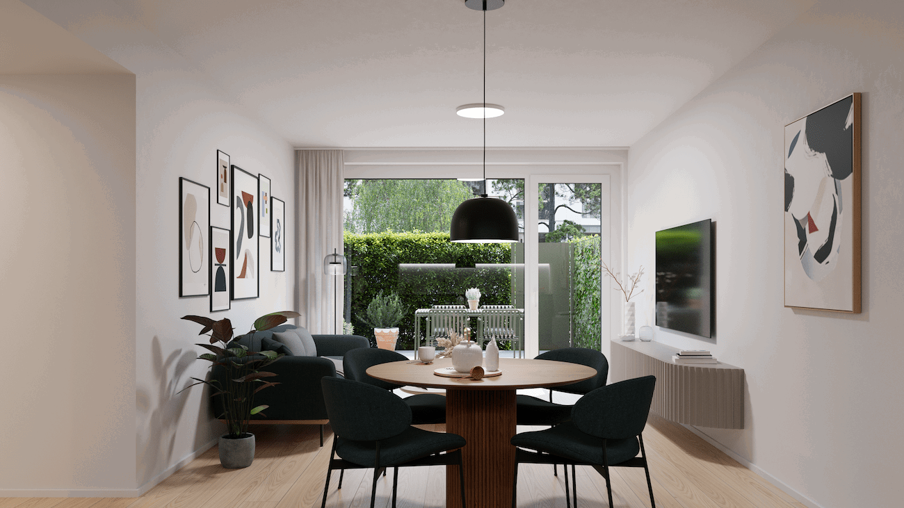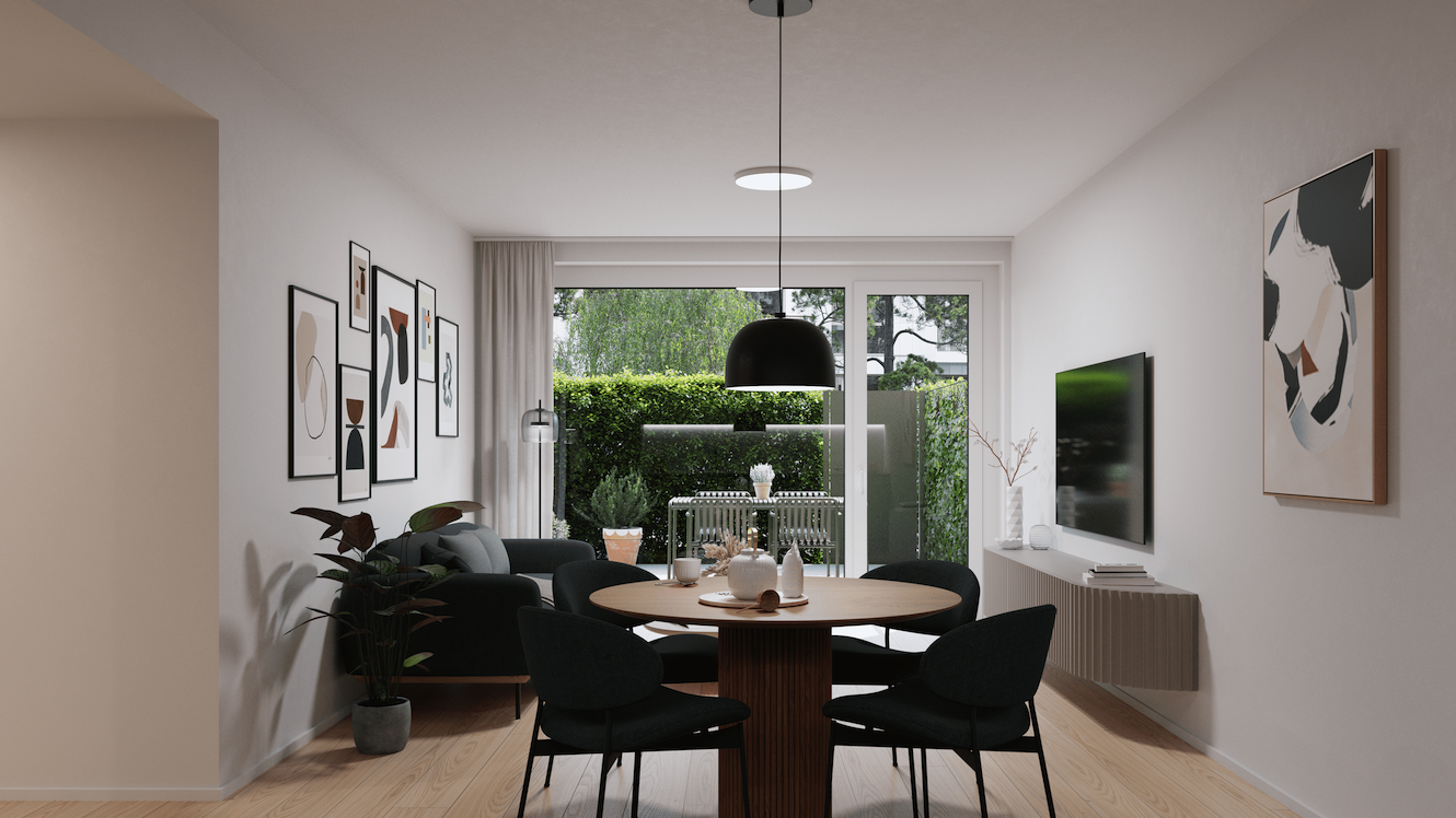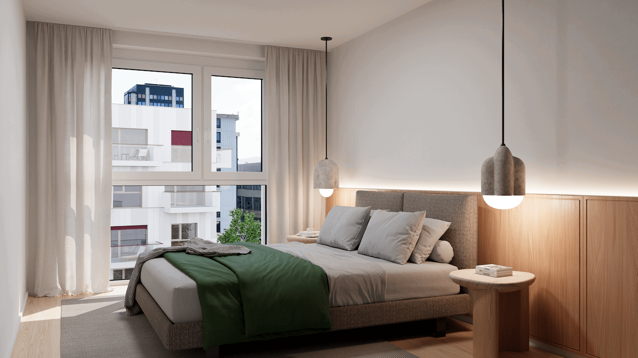 Funkcionalna in estetsko dovršena stanovanja z visokimi stropi in velikimi steklenimi površinami ustvarjajo svetlo in zračno okolje, ki je prijetno za bivanje v vseh letnih časih.
